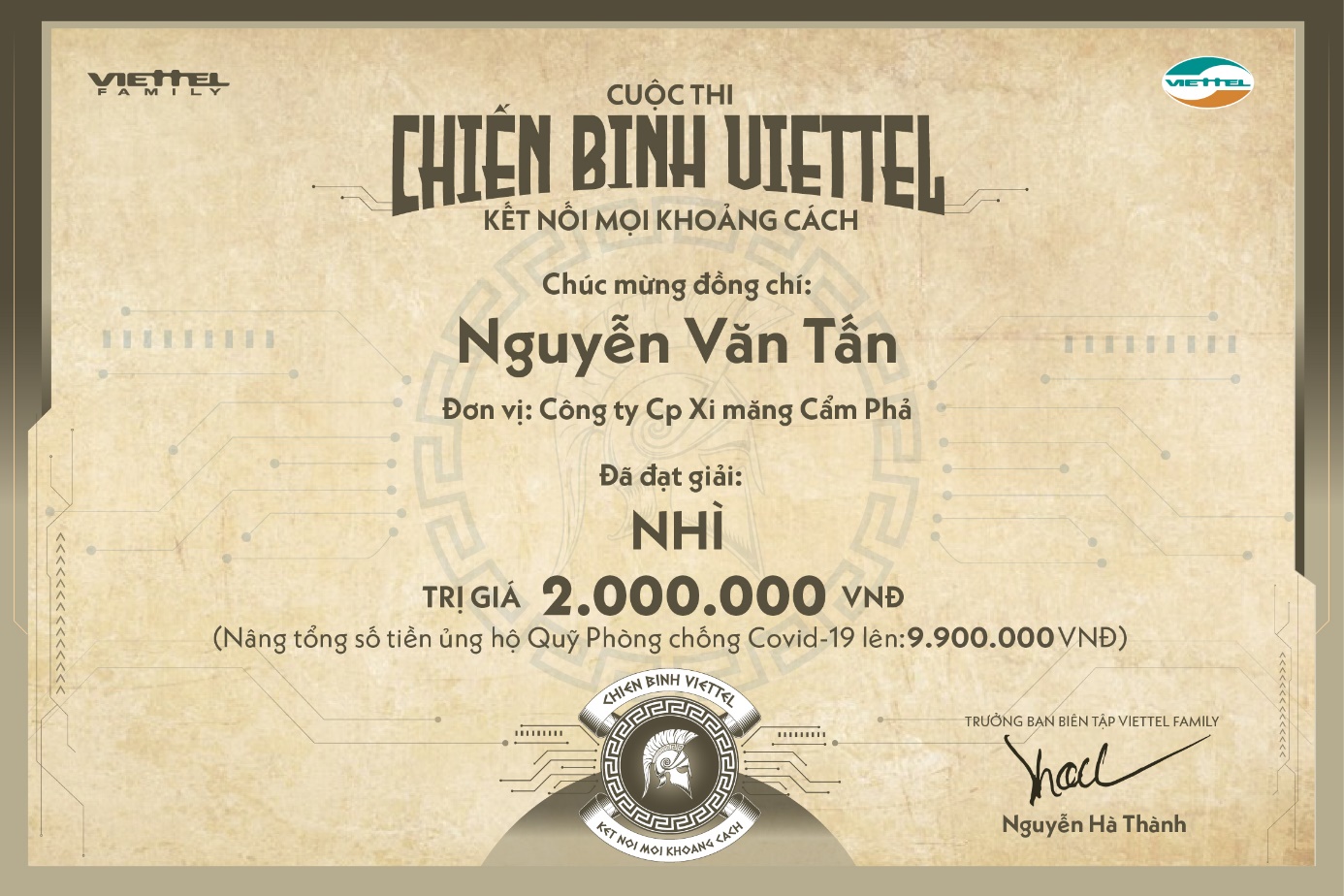 Tuy nhiên, chiến thắng cao nhất của Công ty CP Xi măng Cẩm Phả trong cuộc thi này đều thuộc về mọi CBCNV đã tham gia cuộc thi. Đây là một hoạt động rất ý nghĩa, khi chính CBCNV chúng ta đã tự tạo nên một khoản quỹ để cùng ủng hộ công cuộc phòng chống dịch Covid-19 do Mặt trận Tổ quốc Việt Nam cùng với các Bộ Ban Ngành tổ chức vận động, lan tỏa tinh thần lạc quan của người Viettel chúng ta.