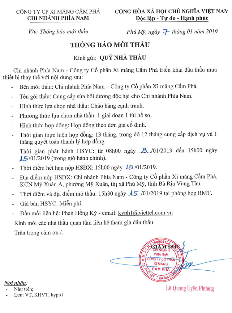 Thông báo mời tham gia đề xuất cung cấp sữa bồi dưỡng độc hại cho Chi nhánh phía Nam