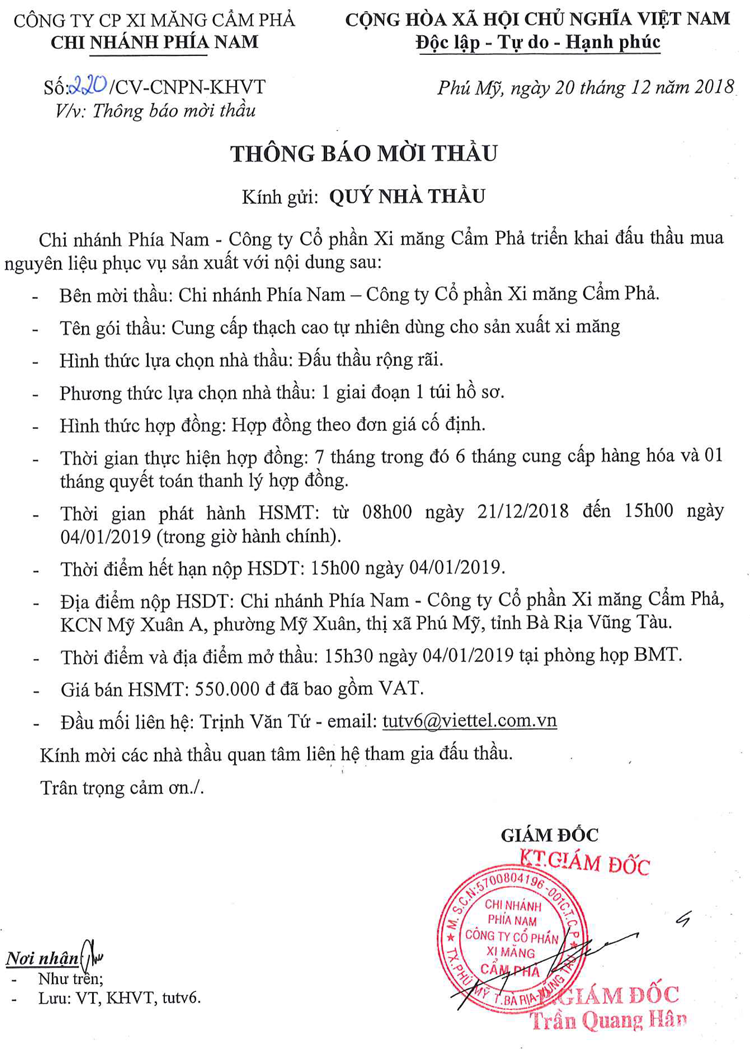 Thông báo mời tham gia đề xuất cung cấp thạch cao tự nhiên dùng cho sản xuất xi măng