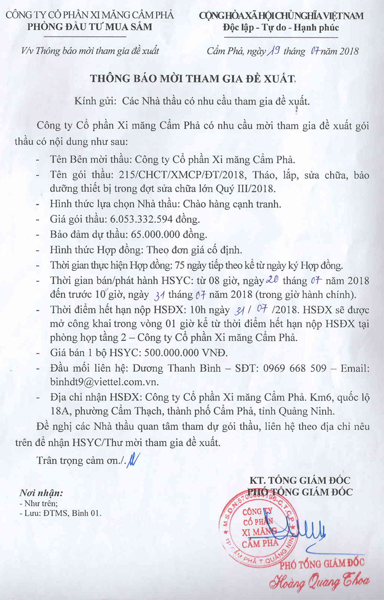 Thông báo mời tham gia đề xuất gói thầu tháo lắp, sửa chữa, bảo dưỡng thiết bị