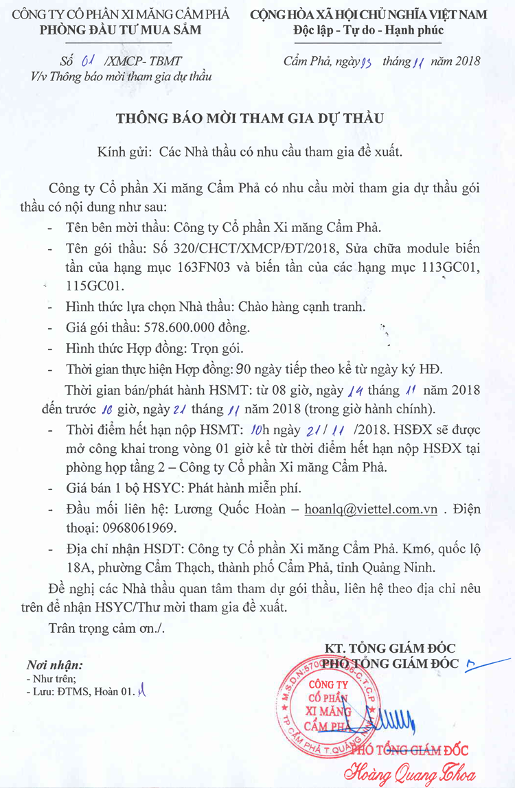 Thông báo mời tham gia đề xuất sửa chữa module biến tần hạng mục 163FN01, 113GC01, 115GC01