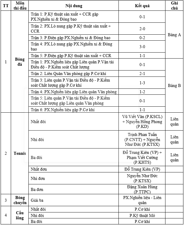 Sau đây là kết quả giải thi đấu thể thao lần thứ 14 của Công ty cập nhật đến ngày 26/05/2022: