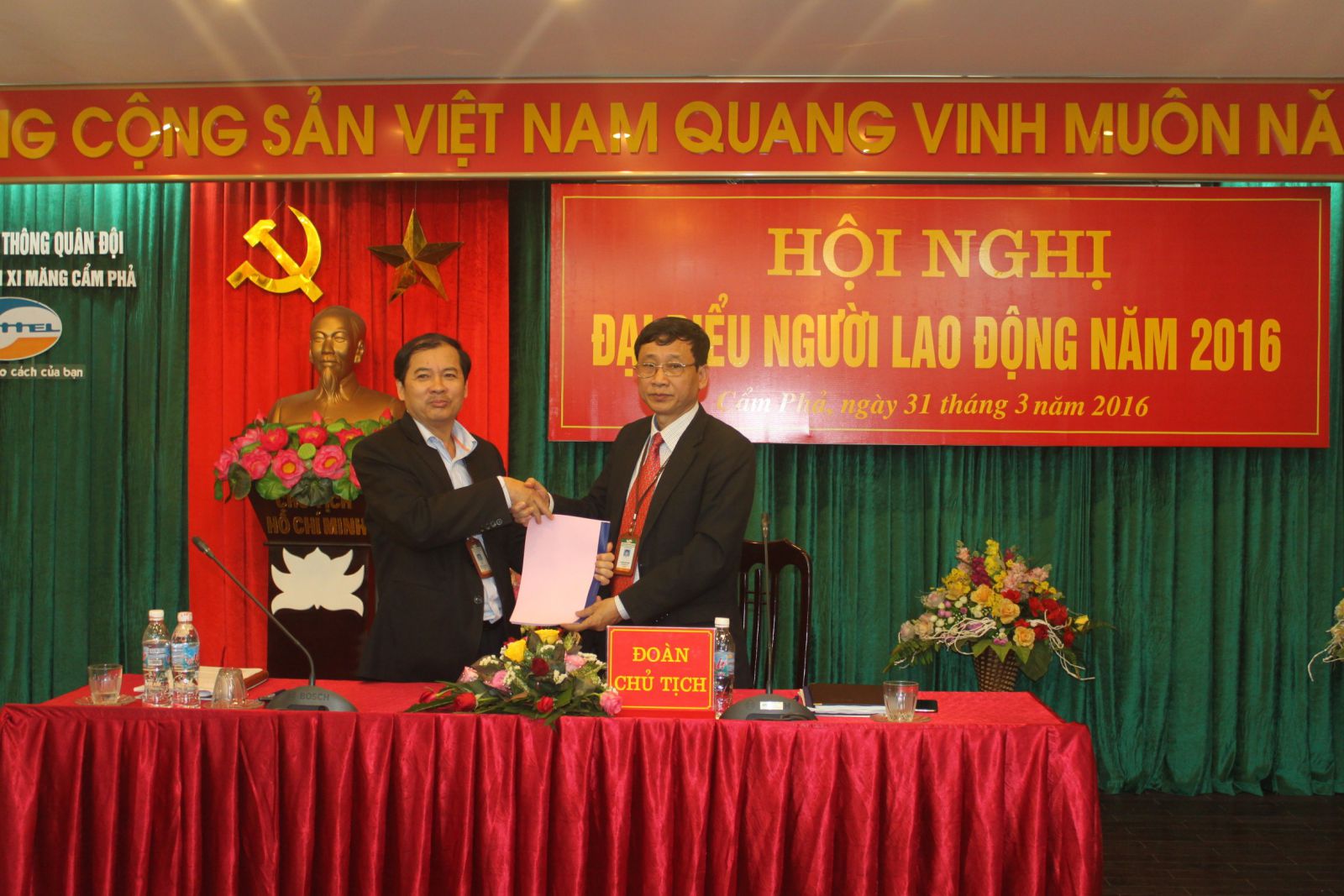 Hội nghị đã chứng kiến Tổng Giám đốc và P.Chủ tịch Công đoàn Công ty ký kết thỏa ước lao động tập thể sửa đổi và phát động thi đua thực hiện Nghị quyết Hội nghị người lao động năm 2016.