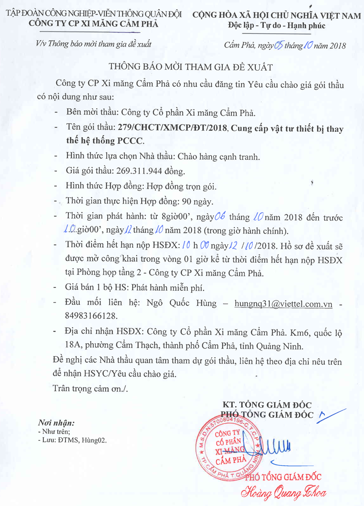 Thông báo mời tham gia đề xuất cung cấp vật tư thiết bị thay thế hệ thống PCCC